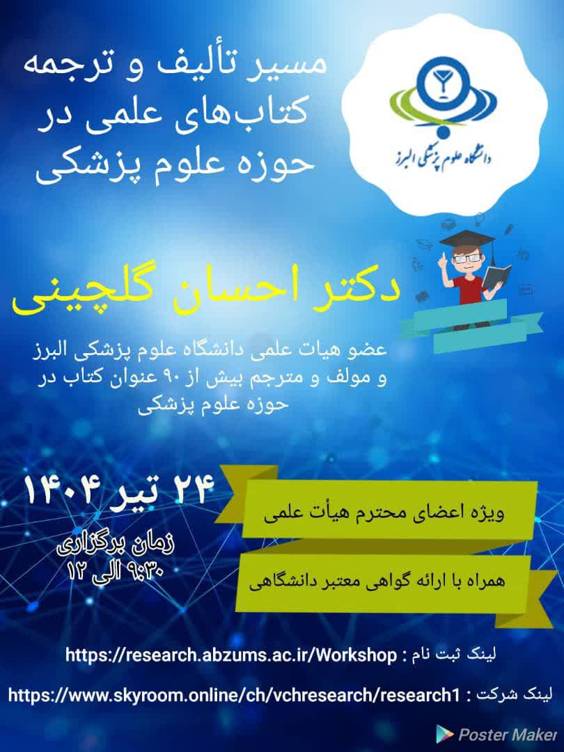 معاونت تحقیقات و فناوری دانشگاه علوم پزشکی البرز در نظر دارد کارگاهی با عنوان مسیر تالیف و ترجمه کتاب های علمی در حوزه علوم پزشکی ویژه اعضای محترم هیات علمی، بصورت حضوری و مجازی با تدریس دکتر احسان گلچینی در تاریخ ۲۴ ماه جاری از ساعت ۹:۳۰ الی ۱۲ برگزار نماید. در این کارگاه کاربردی مسیر گام به گام تالیف و ترجمه کتاب های علمی با تمرکز بر حوزه علوم پزشکی بررسی می شود. شرکت کنندگان با اصول انتخاب موضوع، طراحی ساختار علمی کتاب، نکات کلیدی در ترجمه تخصصی، فرایند آماده سازی برای چاپ، انتخاب ناشر، عقد قرداد و راهکارهای افزایش دیده شدن اثر آشنا خواهند شد. این جلسه فرصتی برای طرح پرسش ها اشتراک تجربه ها و شروع مسیر نشر علمی خواهد بود. علاقمندان می توانند جهت ثبت نام در کارگاه از طریق https://research.abzums.ac.ir/Workshop و جهت شرکت در کارگاه از طریق https://www.skyroom.online/ch/vchresearch/research اقدام نمایند.