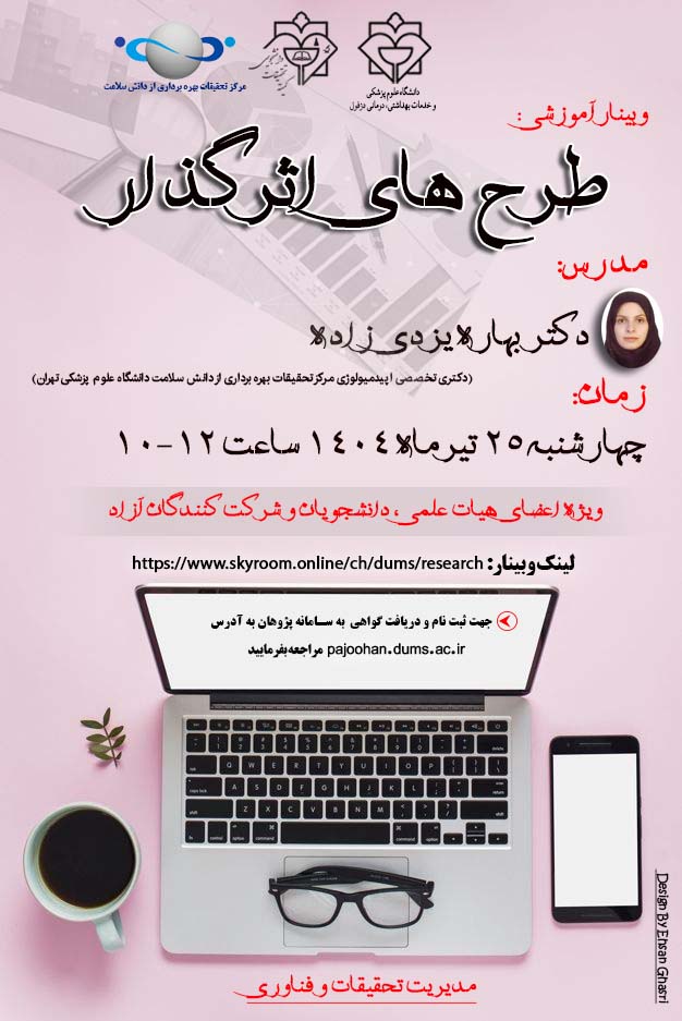 مدیریت تحقیقات و فناوری دانشگاه علوم پزشکی خدمات بهداشتی درمانی دزفول در راستای توانمندسازی اعضای هیات علمی، پژوهشگران، دانشجویان، مدیران و کارشناسان حوزه تحقیقات و فناوری در نظر دارد وبینار آموزشی آشنایی با طرح های اثرگذار را با تدریس دکتر بهاره یزدی زاده متخصص اپیدمیولوژی مرکز تحقیقات بهره برداری از دانش سلامت دانشگاه علوم پزشکی تهران، در روز چهارشنبه مورخ ۲۵ تیر ماه ۱۴۰۴ از ساعت ۱۰:۰۰ الی ۱۲:۰۰ برگزار نماید. علاقمندان می توانند جهت ثبت نام در کارگاه از طریق https://pajoohan.dums.ac.ir/general/homePage.action و جهت شرکت در کارگاه از طریق https://www.skyroom.online/ch/dums/research اقدام نمایند.