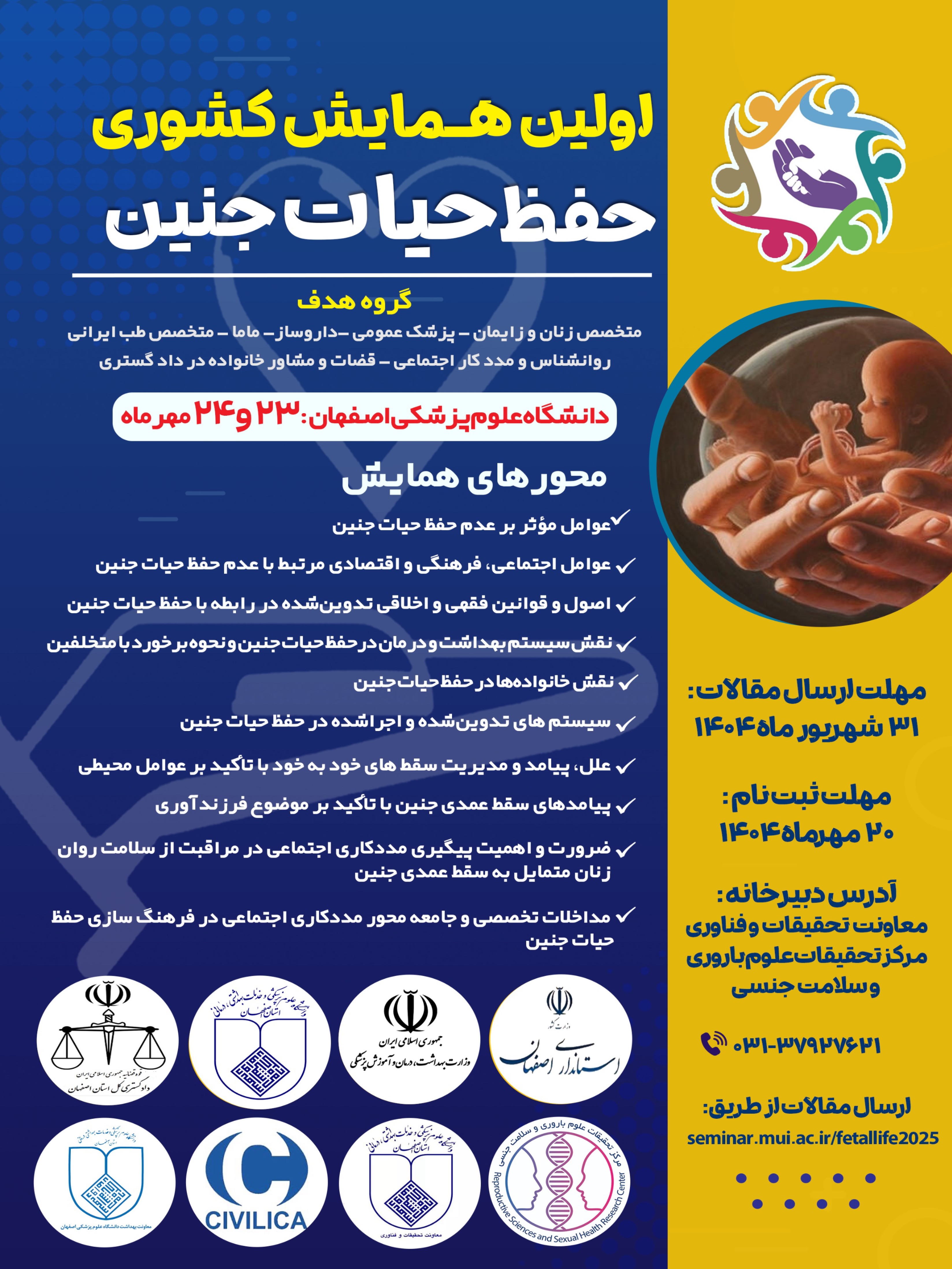 همایش علمی حفظ حیات جنین در تاریخ های ۲۳ و ۲۴ مهر ماه ۱۴۰۴ توسط دانشگاه علوم پزشکی اصفهان برگزار می شود. عوامل مؤثر بر عدم حفظ حیات جنین، عوامل اجتماعی، فرهنگی و اقتصادی مرتبط با عدم حفظ حیات جنین، اصول و قوانین فقهی و اخلاقی تدوینشده در رابطه با حفظ حیات جنین، نقش سیستم بهداشت و درمان در حفظ حیات جنین و نحوه برخورد با متخلفین، نقش خانوادهها در حفظ حیات جنین، سیستم های تدوینشده و اجرا شده در حفظ حیات جنین، علل، پیامد و مدیریت سقط های خود به خود با تأکید بر عوامل محیطی، پیامدهای سقط عمدی جنین با تأکید بر موضوع فرزندآوری، ضرورت و اهمیت پیگیری مددکاری اجتماعی در مراقبت از سلامت روان زنان متمایل به سقط عمدی جنین و مداخلات تخصصی و جامعه محور مددکاری اجتماعی در فرهنگ سازی حفظ حیات جنین محورهای این همایش هستند.علاقمندان می توانند جهت کسب اطلاعات بیشتر و ثبت نام از طریق https://seminar.mui.ac.ir/fetallife2025/fa/?time=1753590789 اقدام نمایند.