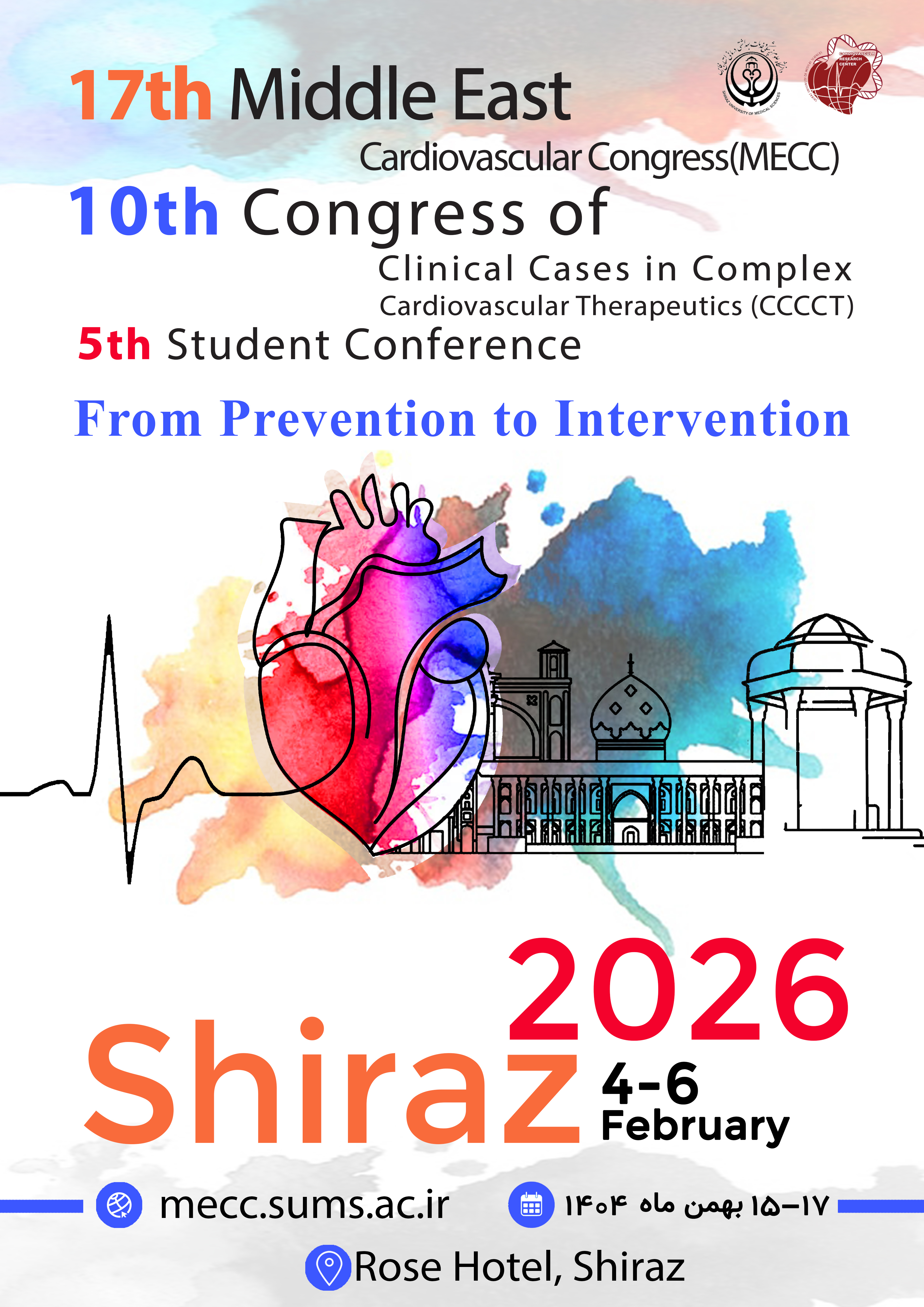 هفدهمین کنگره بین المللی قلب خاورمیانه و دهمین همایش مداخلات پیچیده قلبی همراه با پنجمین کنفرانس دانشجویی از تاریخ ۱۵ لغایت ۱۷ بهمن ماه سال جاری برابر با ۴ لغایت ۶ فوریه سال ۲۰۲۶ در شهر صدرای شیراز هتل بین المللی رز برگزار خواهد گردید. علاقمندان می توانند جهت کسب اطلاعات بیشتر از طریق https://mecc.sums.ac.ir/fa/?time=1761626301 اقدام نمایند.