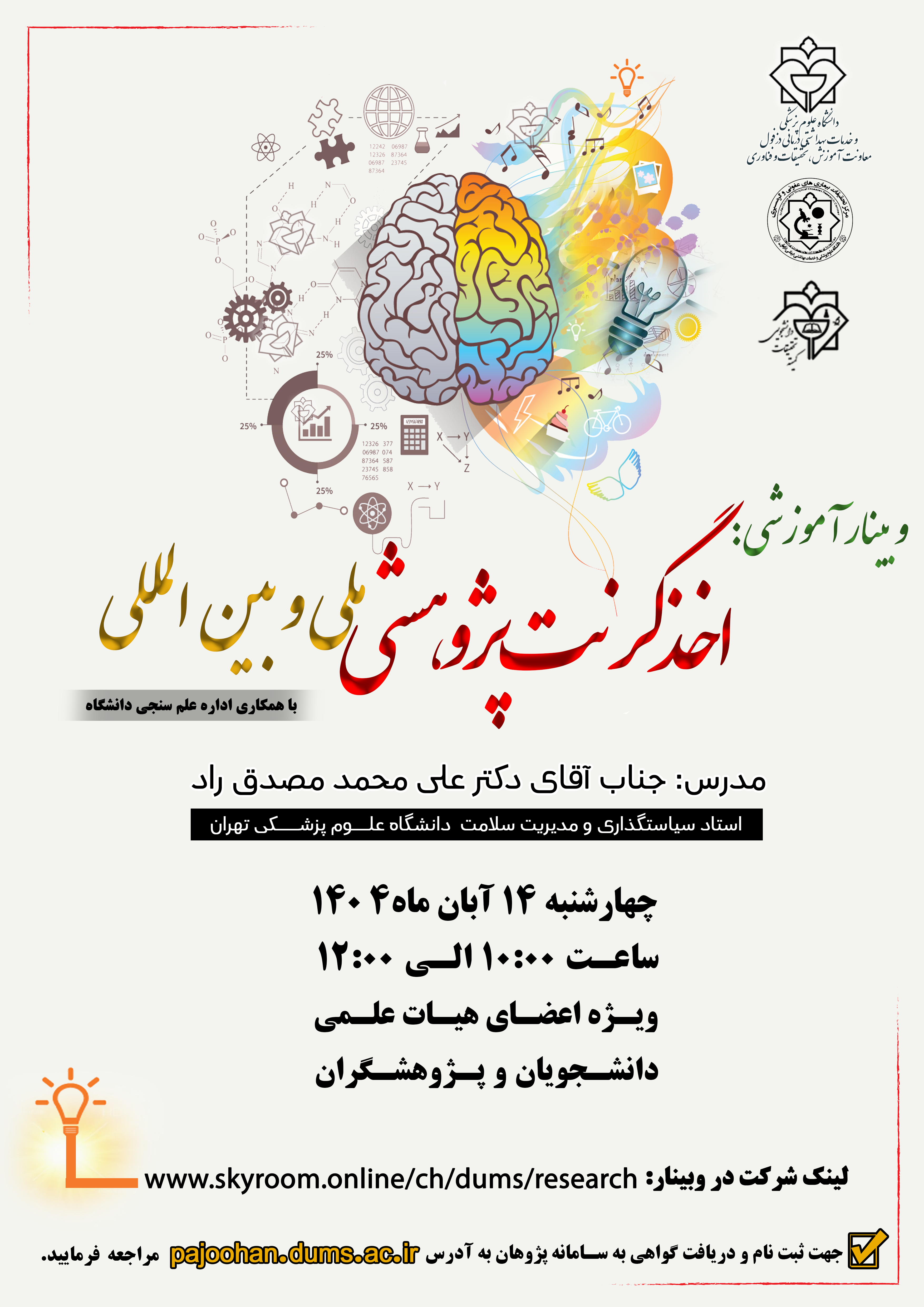 مدیریت تحقیقات و فناوری دانشگاه علوم پزشکی خدمات بهداشتی درمانی دزفول در راستای توانمندسازی اعضای محترم هیات علمی پژوهشگران دانشجویان مدیران و کارشناسان حوزه تحقیقات و فناوری در نظر دارد وبینار آموزشی اخذ گرنت پژوهشی ملی و بین المللی با تدریس دکتر على محمد مصدق راد (استاد سیاستگذاری و مدیریت سلامت دانشگاه علوم پزشکی تهران) را در روز چهارشنبه ۱۴ آبان ماه ۱۴۰۴ از ساعت ۱۰:۰۰ الی ۱۲:۰۰ در دانشگاه برگزار نماید. علاقمندان می توانند جهت شرکت در وبینار از طریق https://www.skyroom.online/ch/dums/research اقدام نمایند.