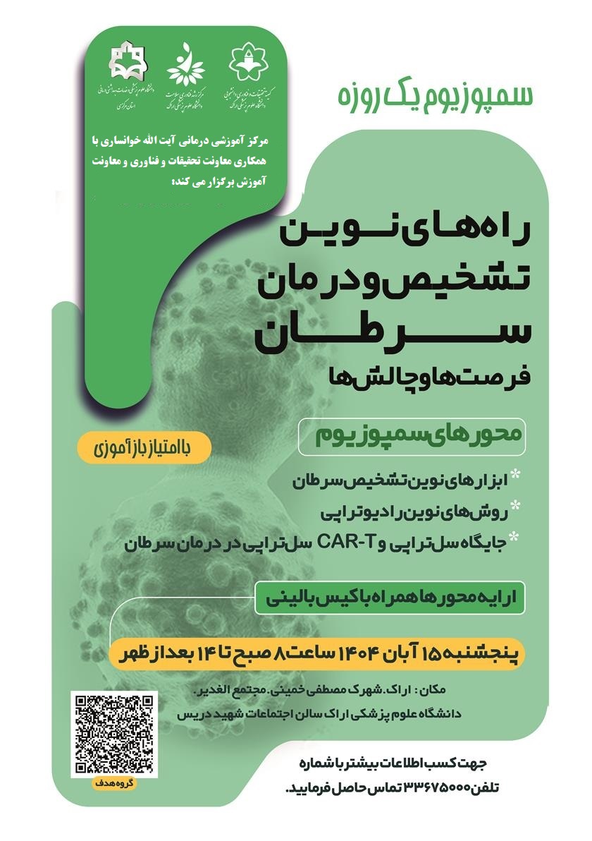 سمپوزیوم یک روزه راه های نوین تشخیص و درمان سرطان با محورهای ابزارهای نوین تشخیص سرطان، روش های نوین رادیوتراپی و جایگاه سل تراپی و CAR-T سل تراپی در درمان سرطان توسط معاونت تحقیقات و فناوری و با همکاری مرکز آموزشی درمانی آیت الله خوانساری در تاریخ ۱۵ آبان ماه سال جاری در مجتمع الغدیر دانشگاه علوم پزشکی اراک سالن اجتماعات شهید دریس برگزار می شود. علاقمندان جهت کسب اطلاعات بیشتر می توانند با شماره ۰۸۶۳۳۶۷۵۰۰۰ تماس حاصل فرمایند.