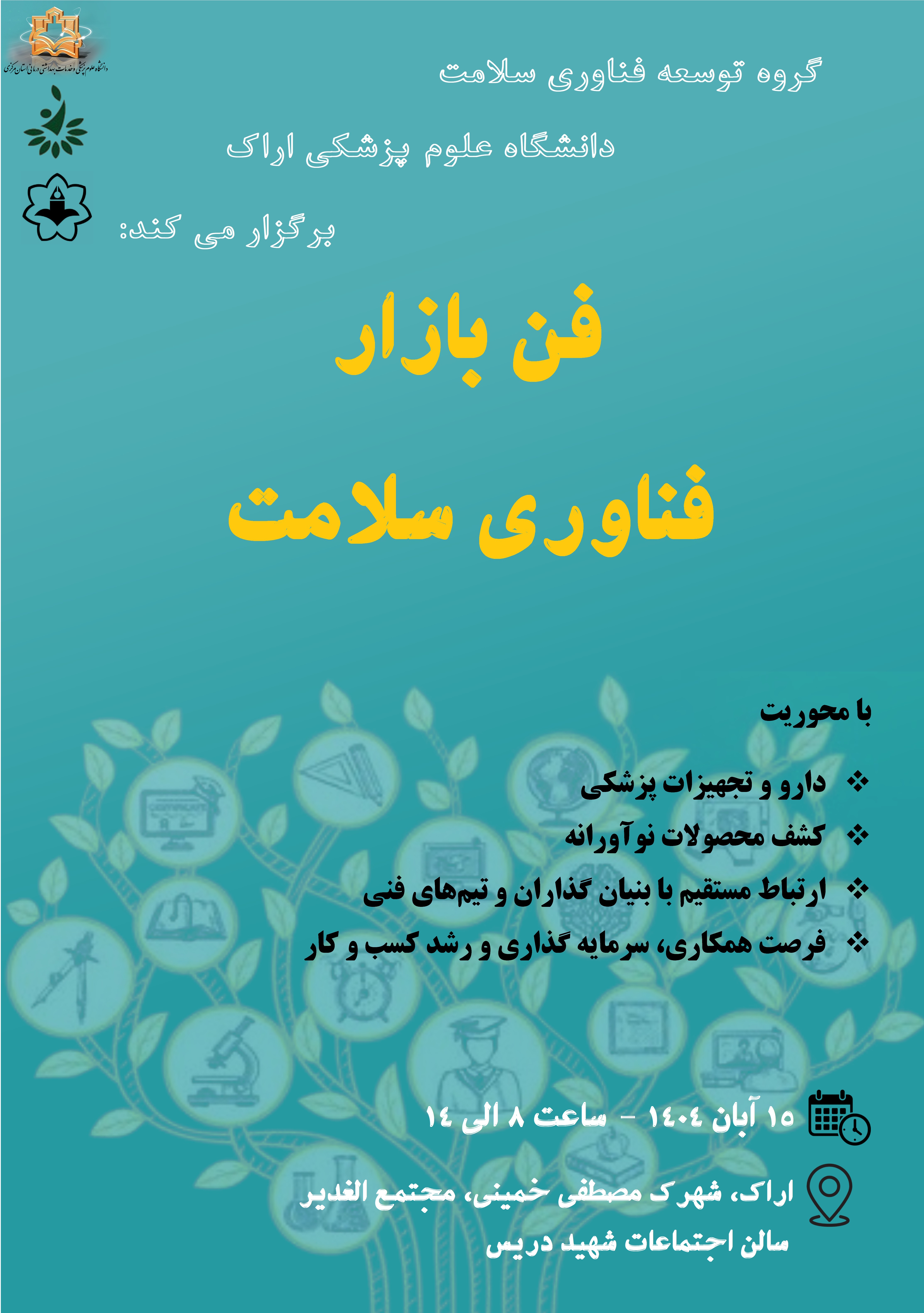 لازم به ذکر است که فن بازار فناوری سلامت در تاریخ ۱۵ آبان جاری در محل طبقه همکف مجتمع الغدیر دانشگاه علوم پزشکی اراک (سالن اجتماعات شهید دریس) برگزار می شود.